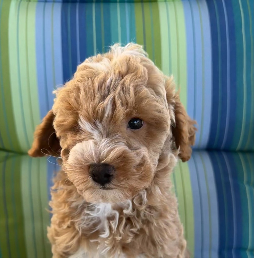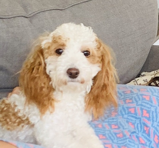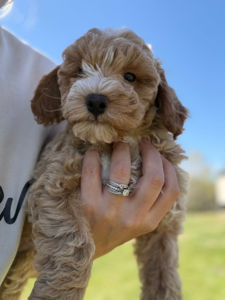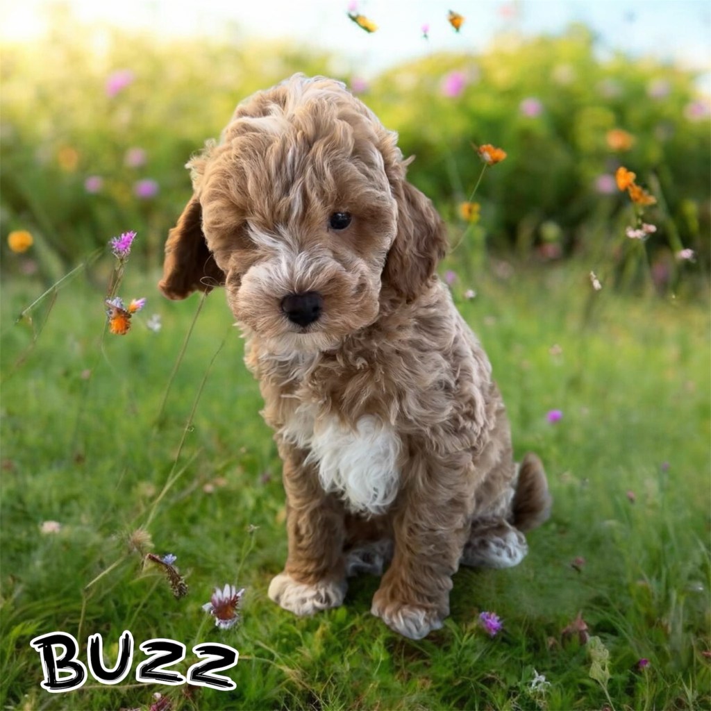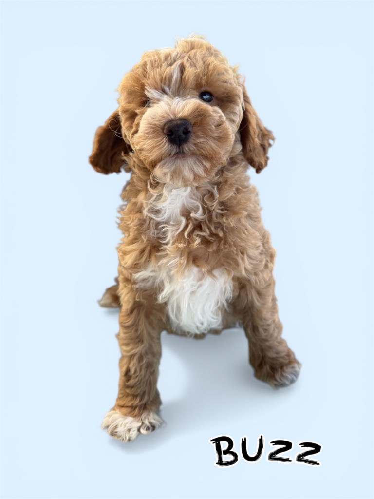 Buzz is a sweet, bouncy loving mini Goldendoodle that will be 15-20lbs full grown. He is the perfect size to take along with you! He has a gorgeous apricot curly coat that will be little to no shedding and just check out those adorable white markings! He has been well handled and adores children. Come meet this sweet guy today!