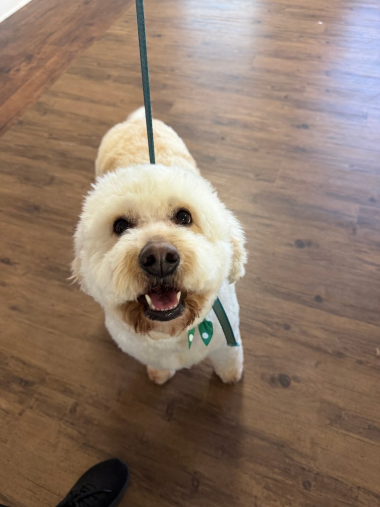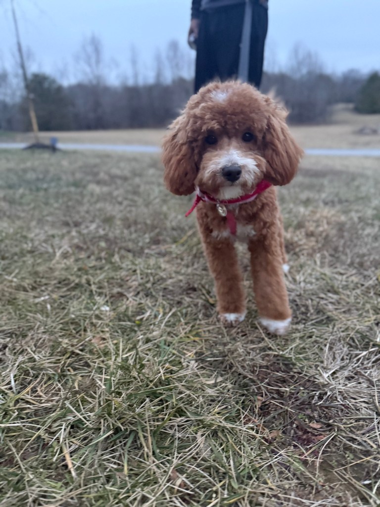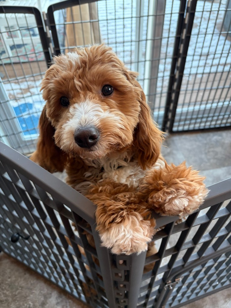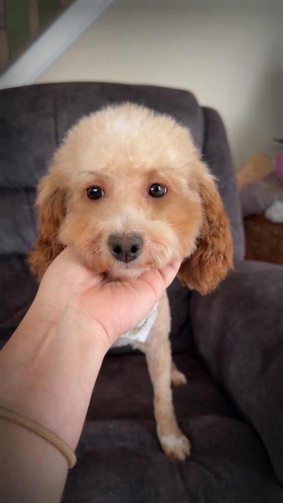Buzz is a sweet, bouncy loving mini Goldendoodle that will be 15-20lbs full grown. He is the perfect size to take along with you! He has a gorgeous apricot curly coat that will be little to no shedding and just check out those adorable white markings! He has been well handled and adores children. Come meet this sweet guy today!